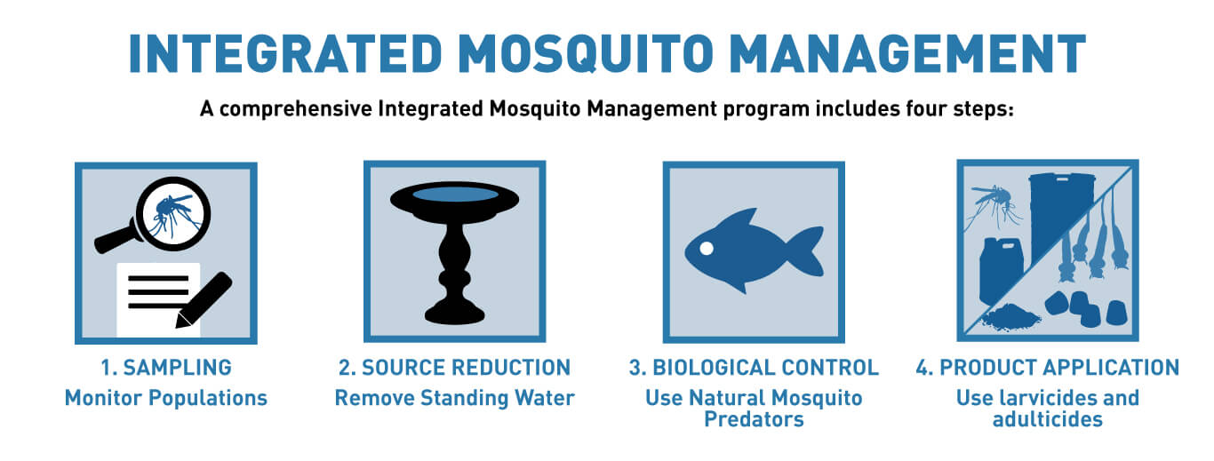 Establishing an integrated mosquito management (IMM) approach is necessary for complete coverage and control. IMM includes four steps: 1. Sampling, which includes the monitoring of breeding sites, 2. Source Reduction, where standing water is removed to limit potential breeding sites, 3. Biological Control through the use of naturally occurring mosquito predators and 4. Product Application consisting of larvicides for prevention and adulticides to address the current population of disease-spreading mosquitoes.